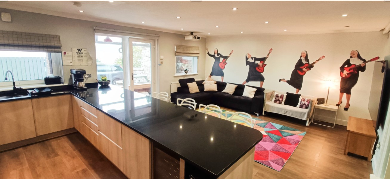 The lounge area makes an immediate statement with its quirky and sophisticated nun-themed feature wallpaper, offering a playful nod to the property’s name. Sink into the luxurious seating while enjoying a movie or game on the massive 85-inch Smart TV. Entertainment is guaranteed with a PlayStation console available for guests.